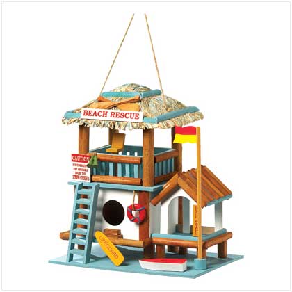 WP39558 Bring a bit of breezy bayside fun to your yard with this cute-as-a-button birdhouse! Summery colors and nautical theme make this a bright and cheerful accent. Trimmed with a host of lifelike lifeguard accessories, this quaint little shack snugly shelters any flock of beachgoing birdies. Rope at top for hanging. Wood. 9 1/2" x 6 3/4" x 10 1/2" high.