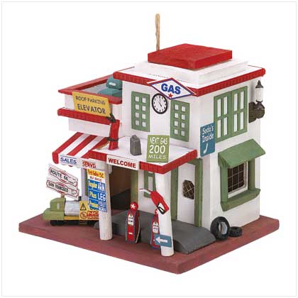 WP39563 Whimsical birdhouse recalls the bygone days when the car was king and gas stations ruled the roadside! Delightfully decorated with an array of authentic service station touches. All-wood construction features a generous entrance and a roomy shelter for a feathered family. Rope at top for hanging. Wood. 10 1/4" x 8" x 9" high.