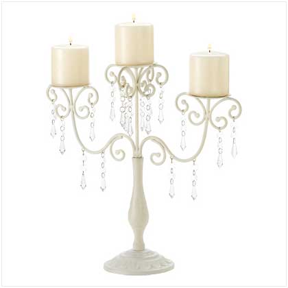 WP-39784 Dripping with glittering crystals, graceful ivory curlicues create a showy support for a trio of candles. Delightfully extravagant with a touch of Old-World elegance! Metal and acrylic. Candles not included. 16 1/4" x 5 1/2" x 14 1/2" high. Retail Price:
