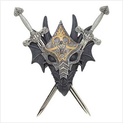 WP-39269 From beneath the hood of his intricate armor, a horned dragon inspires heartfelt fear with his malicious stare. Removable swords are a chillingly accurate miniature version of the mighty weapons wielded by history's fiercest warriors. A crest fit for a king, ready to mount on wall or door of your own castle! Polyresin with pewter swords. 8 5/8" x 2" x 9 1/2" high.