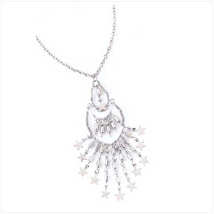 WP-39515 A dazzling dance of tiny stars and silvery beads sparks your favorite fashions with a celestial glow! Gorgeous flowing pendant captures the glory of a starry night sky. Long and lovely 24” chain features a dramatic double-loop pendant for magical eye-catching sparkle. Metal. 24" long.